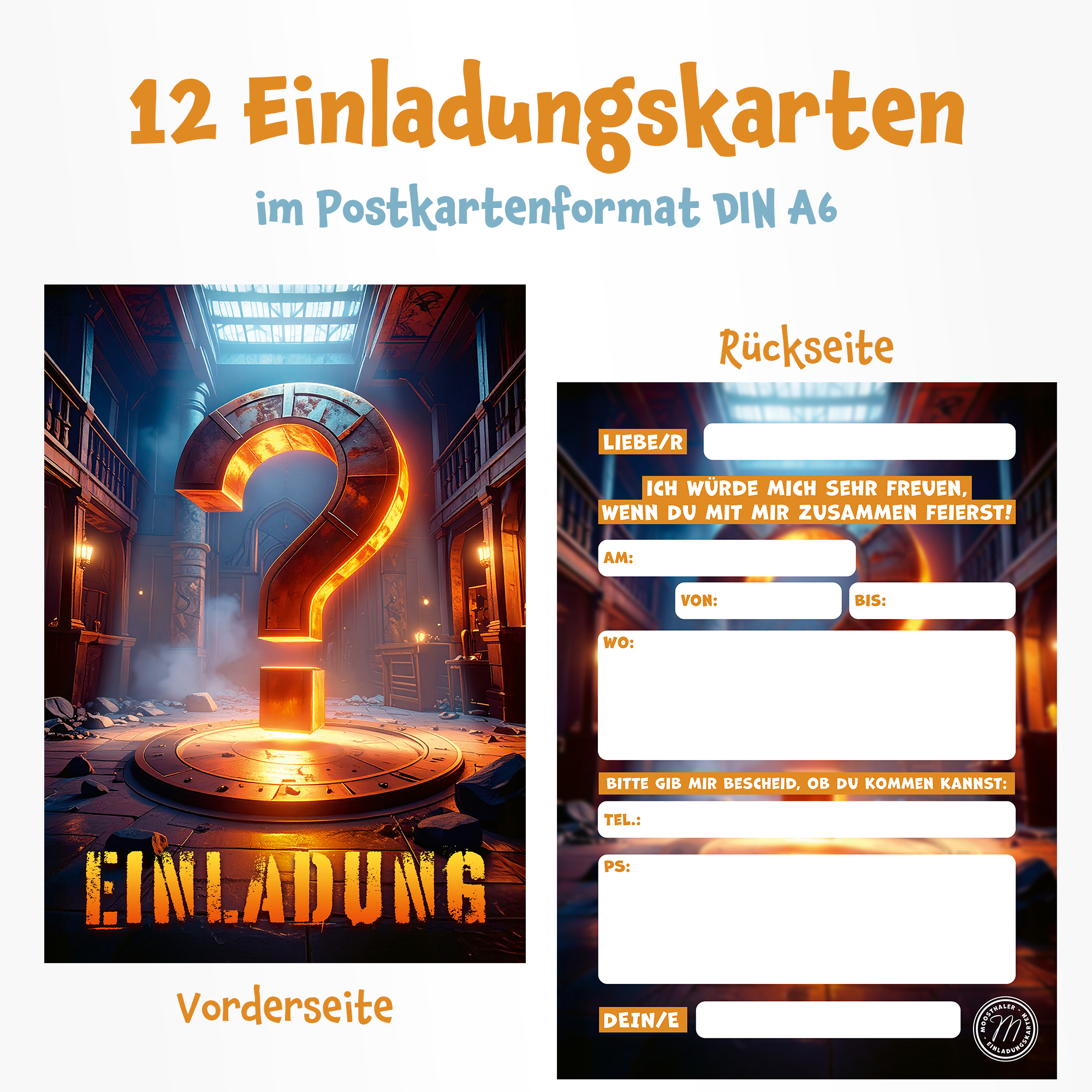 12 Einladungskarten im A6-Postkartenformat (10,5 x 14,8 cm) – Vorderseiten mit Hochglanz veredelt! Platzsparend und sofort einsatzbereit!