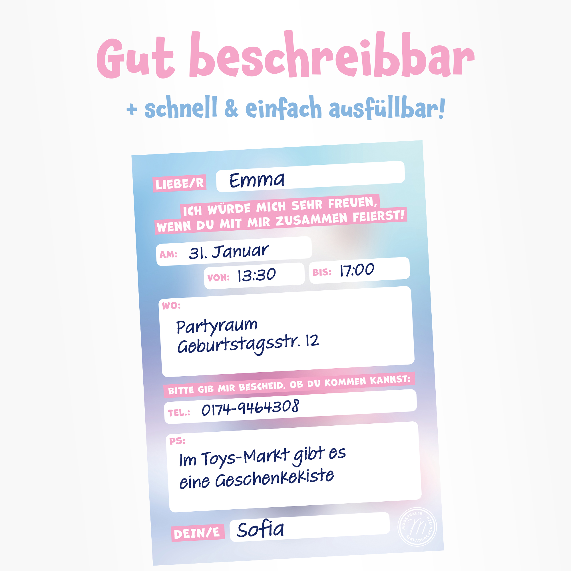 Rückseite mit vorgedruckten Feldern für alle wichtigen Infos – einfach und schnell ausgefüllt! Ideal für Kinder & Eltern!