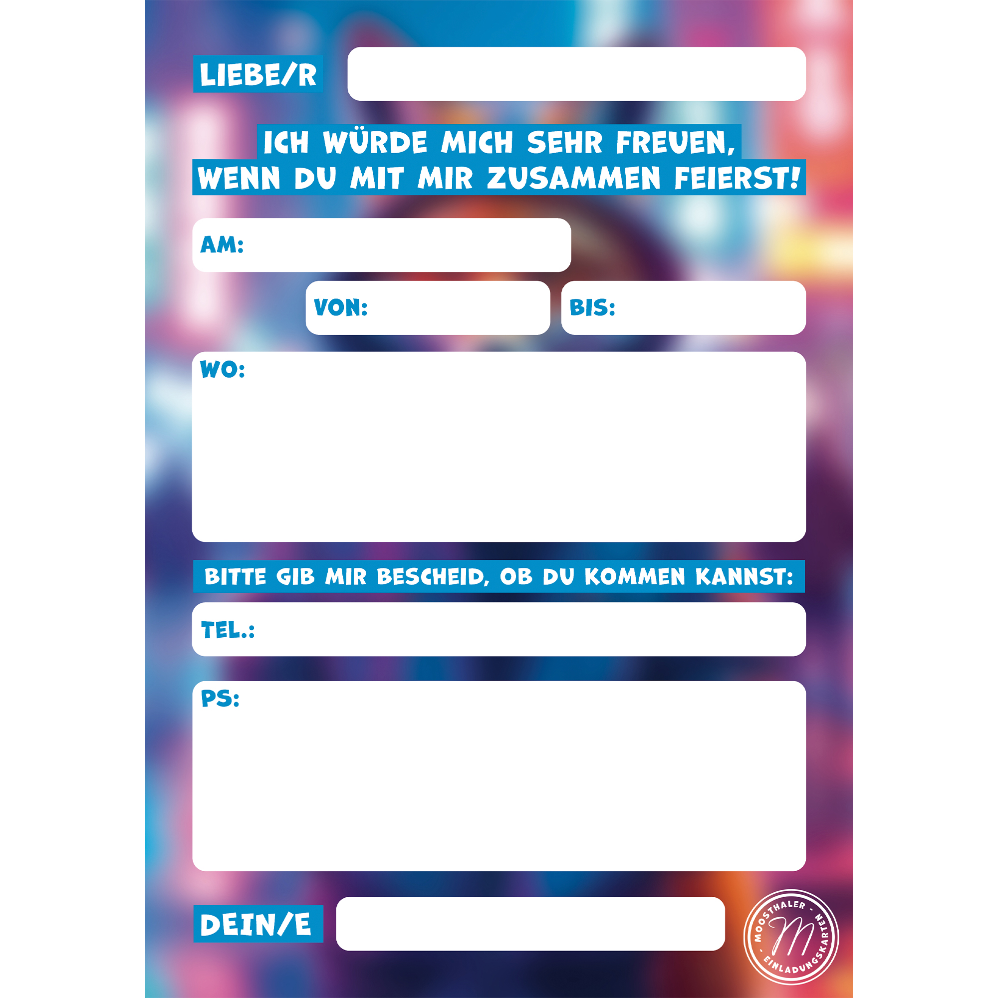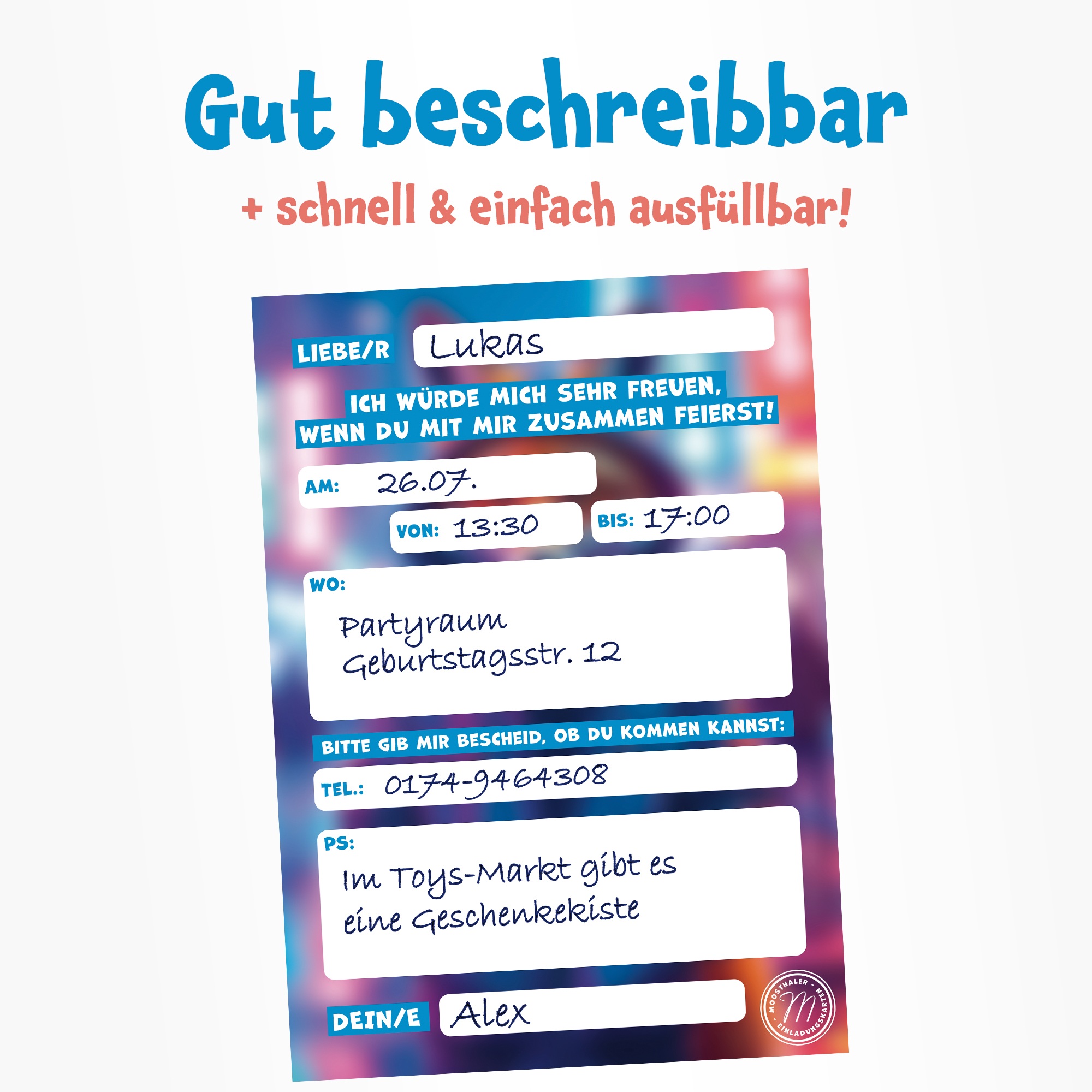 Durch die vordefinierten Felder auf der Rückseite super schnell ausgefüllt! So lassen sich auch größere Party-Crews unkompliziert einladen!